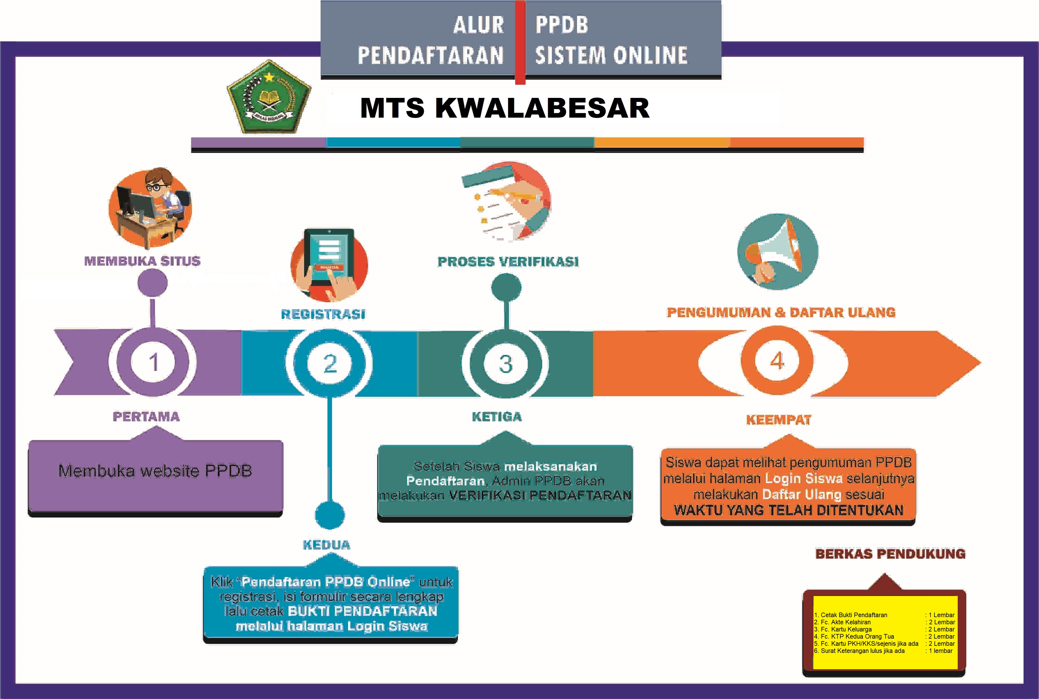 MTS KWALABESAR menyediakan PPDB secara online diharapkan proses PPDB dapat berjalan cepat dan bisa dilakukan dimanapun dan kapanpun selama sesi PPDB Online dibuka. Proses pendaftaran calon siswa baru di masa pandemi Covid-19 ini dan terhambat oleh jarak jika datang ke madrasah langsung, bisa mengakses website PPDB Online MTS KWALABESAR.